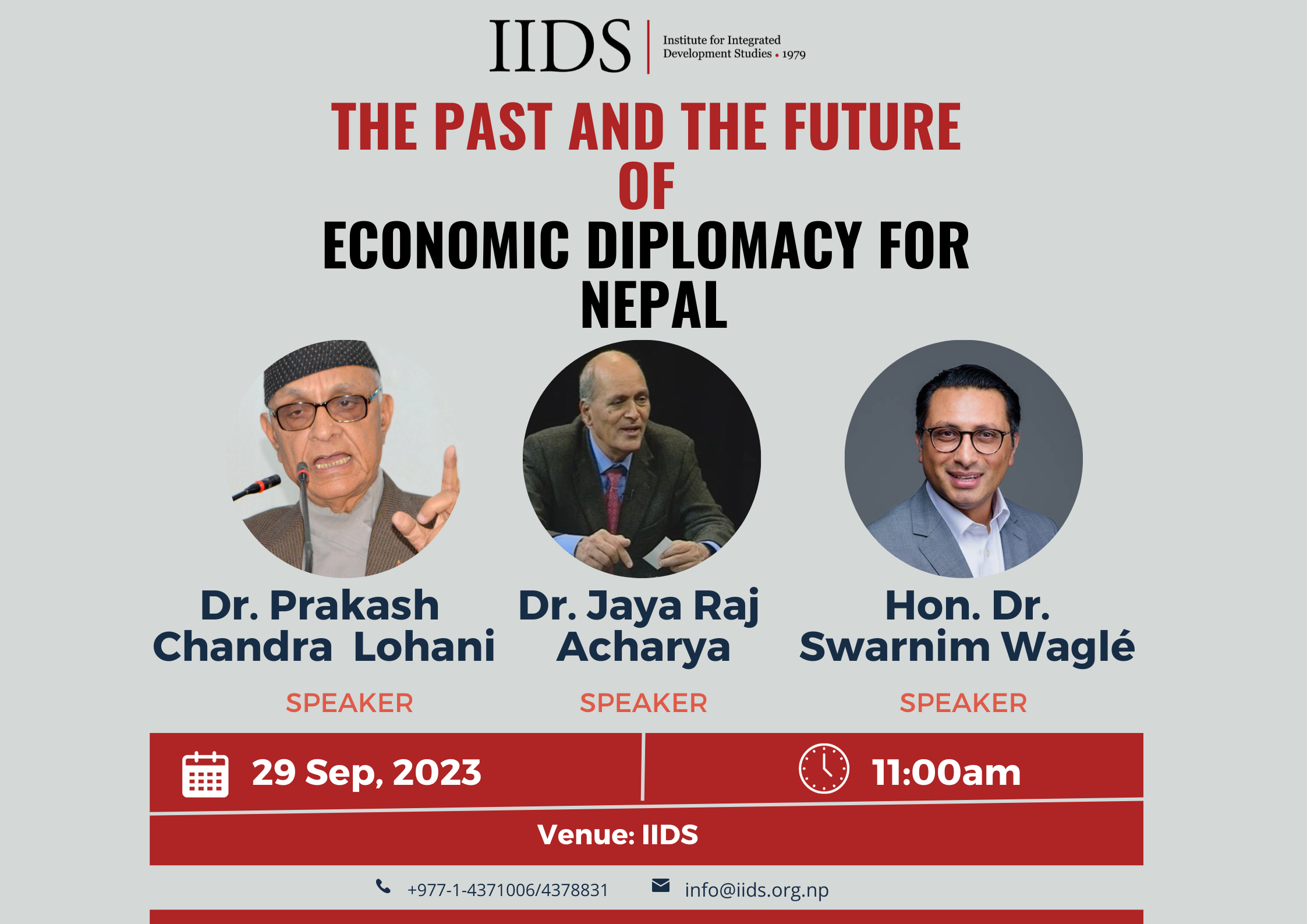 Institute for Integrated Development Studies (IIDS) hosted an event titled “The Past and Future of Economic Diplomacy for Nepal.” The event featured three speakers: Dr. Prakash Chandra Lohani, Dr. Jaya Raj Acharya, and Hon. Dr. Swarnim Wagle.