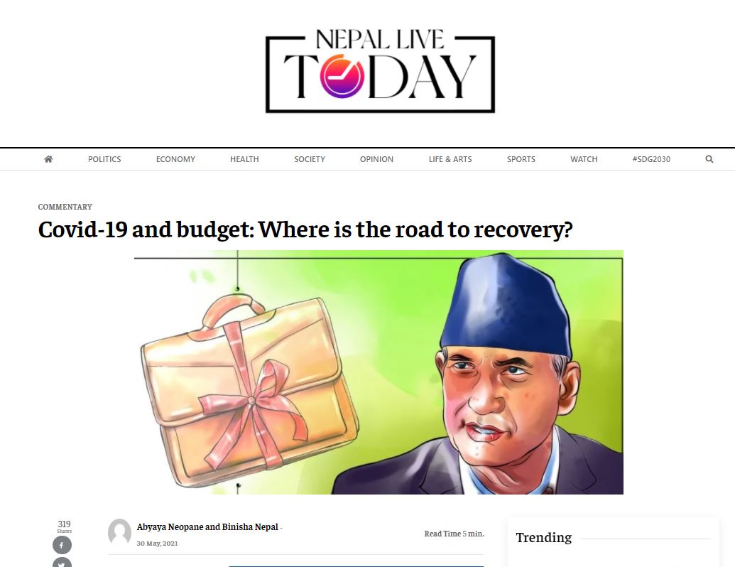 Covid-19 and budget: Where is the road to recovery? Author: Ms. Abyaya Neopane and Ms.Binisha Nepal Year: 2021 Read More Related Items Beyond rescue and relief: Climate change is now Nepal’s economic crisisPublished ArticlesZoom IT’s time to go globalPublished ArticlesZoom Is more credit really the answer?Published ArticlesZoom